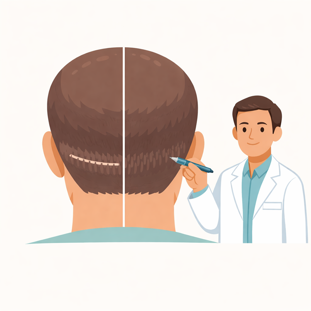 Hair transplant scar repair is a medical procedure designed to minimize the scar and restore hair growth within areas of visible scarring. Scars may result from prior FUT (strip) procedures, trauma, burns, or previous surgeries. Because scar tissue has altered blood supply and different structural properties compared to healthy scalp skin, graft survival requires careful surgical planning and technique. We use several techniques, including using a Follicular Unit Extraction (FUE) transplant to harvest individual grafts and implant them directly into the scar, strategically placing follicular units to break up the linear or patchy appearance of scar tissue. Adjunctive treatments such as PRP injections are recommended to enhance vascularity and support graft survival.